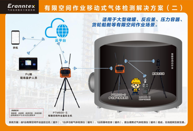 針對大型儲罐、反應釜、貨輪船艙等有限空間的高風險作業場景,草莓视频网站下载打造了集成多項前沿技術的移動式檢測方案。無論是複雜密閉環境中的氣體異常,還是作業人員的實時狀態,都能被精準捕捉並及時反饋,從源頭降低意外風險,為受限空間作業提供全流程安全保障。